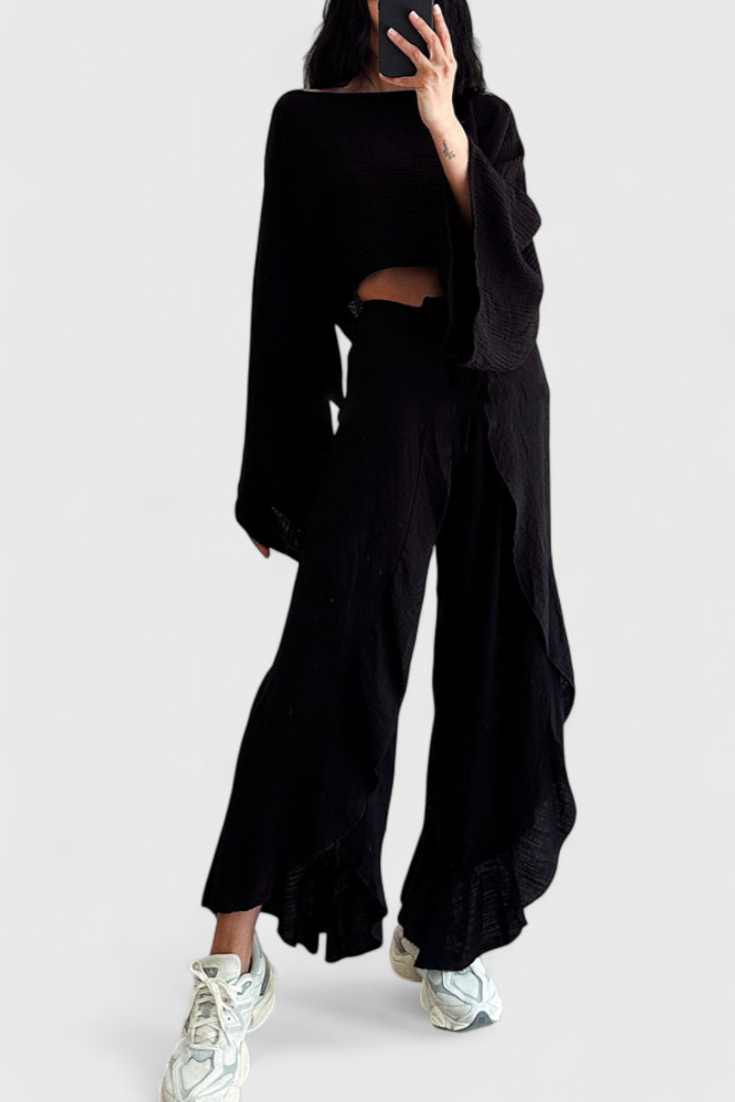 Commodidad avec une toque audaz. Le conjunto Maeva combine un haut court de manga avec ouverture latérale et un pantalon fluide de haute hauteur avec lazo en la cintura, offrant une silhouette moderne et polyvalente. Votre corps est léger et caída suave le convertit en l'élection idéale pour les jours détendus avec style.