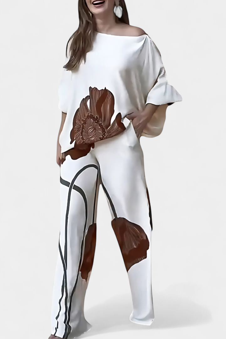Sybella Conjunto Floral de Dos Piezas con Hombro Descubierto y Pantalón Recto