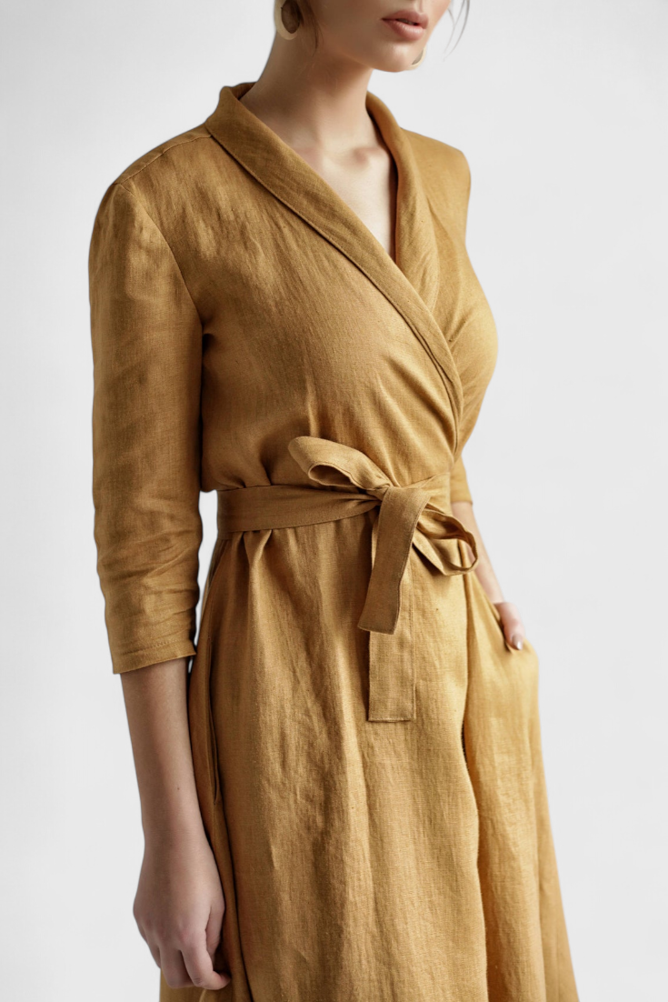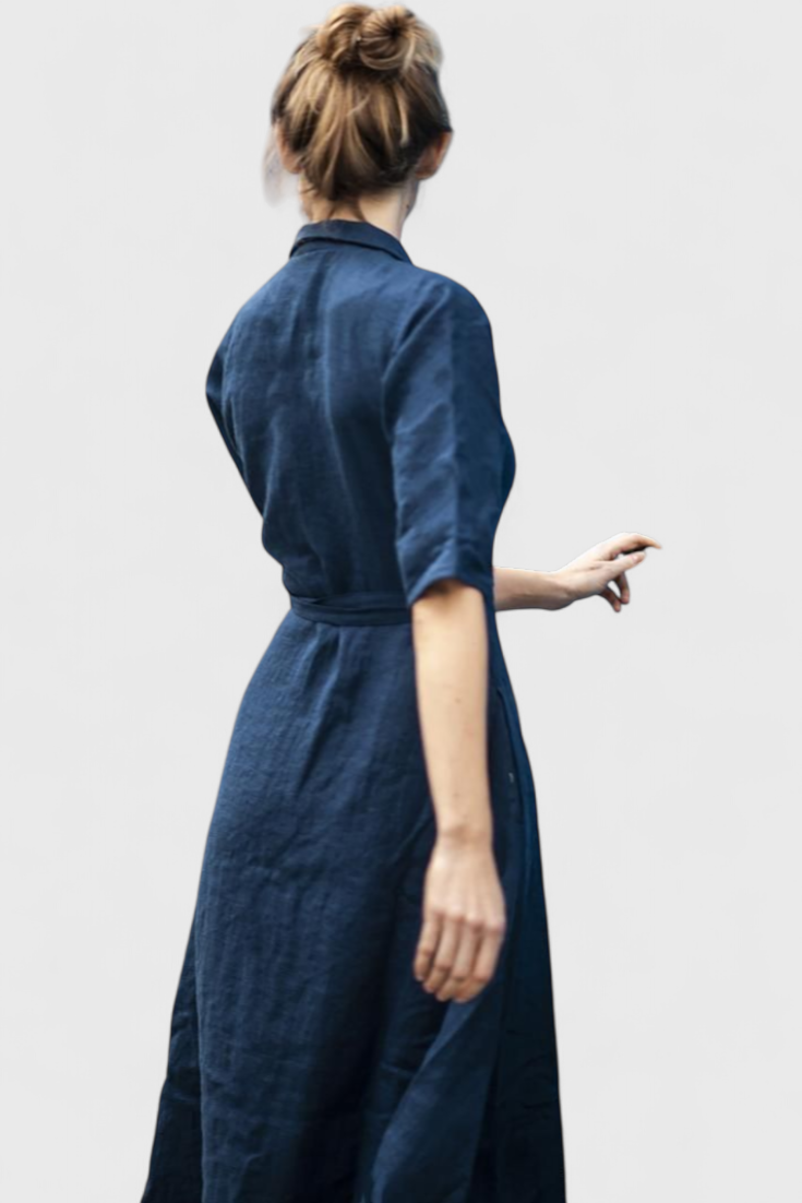 Sharon Robe Midi Vintage de Algodón y Lino avec Cuello de Solapa